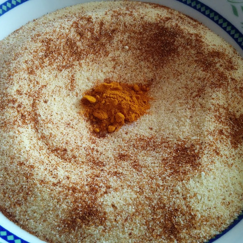 Versate la farina in una cocottina, unite le spezie e il sale, aggiungete l'acqua un po' alla volta e iniziate a mescolare con la forchetta, quando sarà tutta integrata iniziate ad impastare con le mani fino ad ottenere una pallina omogenea (la curcuma macchia un pochino le mani quindi magari utilizzate dei guanti usa e getta). Copritela con la pellicola e fatela riposare per circa una mezz'oretta.