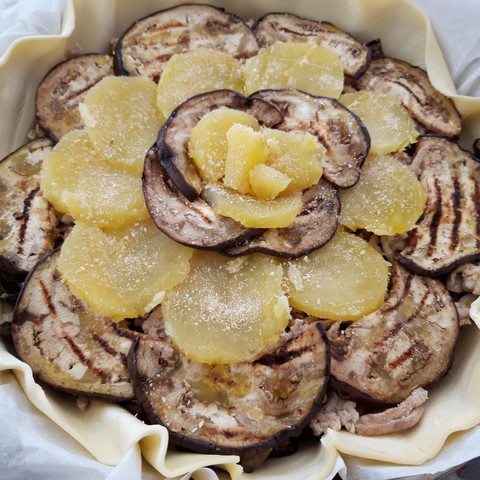 Accendete il forno a 180°. Sbucciate le patate e tagliatele a fette. Disponete la Pasta sfoglia in una pirofila, bucherellate il fondo con la forchetta, versate come base le melanzane a cubetti, poi la carne trita e infine ricoprite con le fette di patate e le mezzelune di melanzane alla piastra.